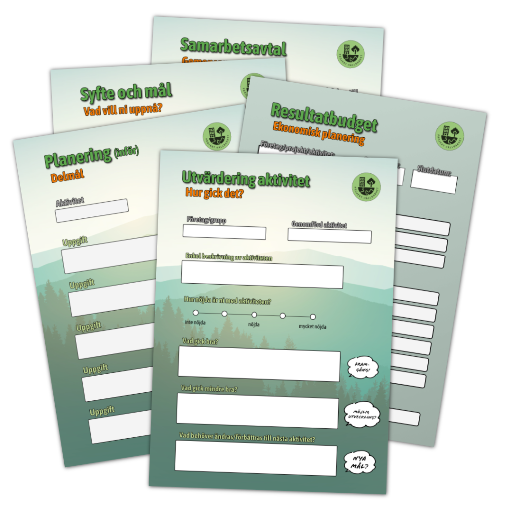 Varje projektgrupp får en egen projektpärm med 10 kapitel där vi går igenom processen steg för steg. I kapitlen förklaras det hur eleverna ska arbeta med respektive moment och varför och genom hela materialet finns en tydlig röd tråd som tar eleverna från start till mål. Samtliga arbetsmoment i pärmen kopplas till digitala formulär som gruppen använder för att genomföra respektive arbetsuppgifter. När gruppen är klar med ett formulär så skriver de ut dessa och sätter in dom i pärmen så de har allt material samlat på ett och samma ställe. På detta vis blir det enkelt för gruppen att få en god överblick av vilka arbetsmoment man har gjort och vad man har kommit överens om.